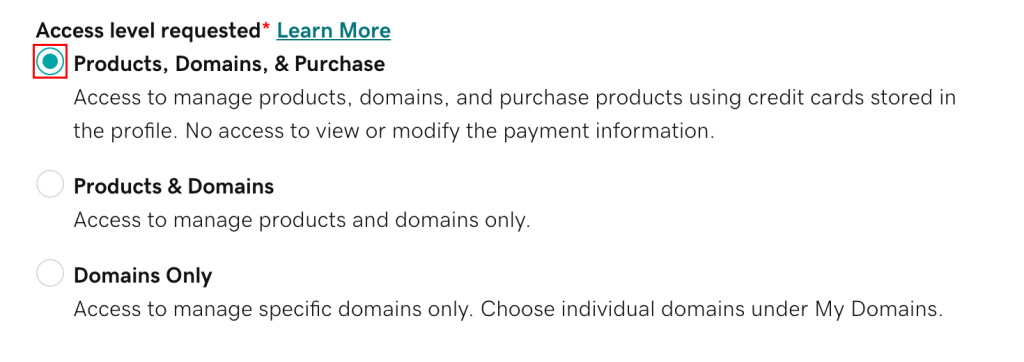 - Select Products, Domains, & Purchases to provide proper access for us.