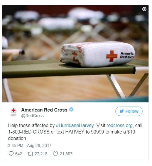 The organization is urging people to call 1-800-RED CROSS or text HARVEY to 90999 to make a $10 donation for those in need.