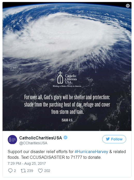 To donate, text CCUSADISASTER to 71777 or visit www.catholiccharitiesusa.org