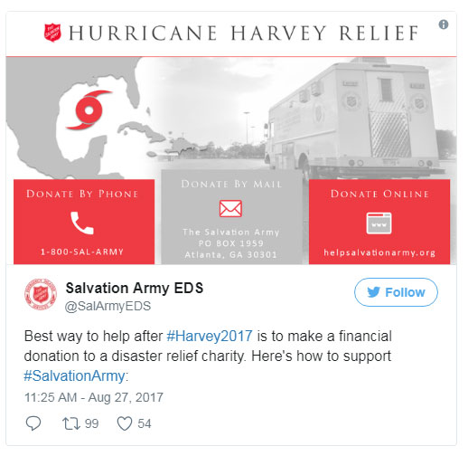 Salvation Army Emergency Disaster Services is the disaster relief arm of the Protestant charitable organization, and it is taking donations to help victims of Harvey.