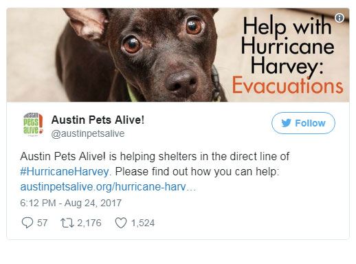 Austin Pets Alive! is an animal shelter and no-kill pet advocacy group seeking assistance to help with pets, following the onset of the storm, and has created a page on its website specific to Hurricane Harvey-related needs.