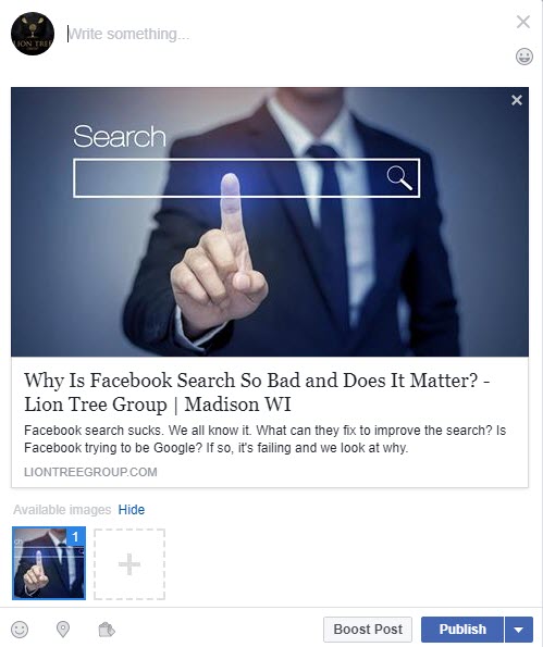 One of the unforeseen issues we’ve had is changing post and page link images. When you create a page link preview in Facebook by pasting a URL in as a status update, it will grab photos from that page URL. Until recently, you could add a photo using the plus symbol underneath the post preview in Facebook and then remove the photos you don’t want listed. Unfortunately, now when you want to do a post link, you’ll need to add the specific image to the page before