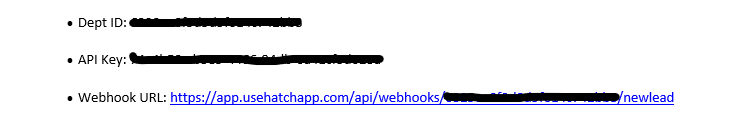 1. Your Hatch Representative should provide you with three items:  Dept ID, API Key, and Webhook URL.