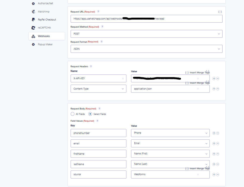 Install the Webhook addon and then navigate over to the form that you want to integrate with Hatch.  You will now see the webhook Option where will create a new webhook feed.  Copy and paste the Webhook URL, select post and select JSON as format.