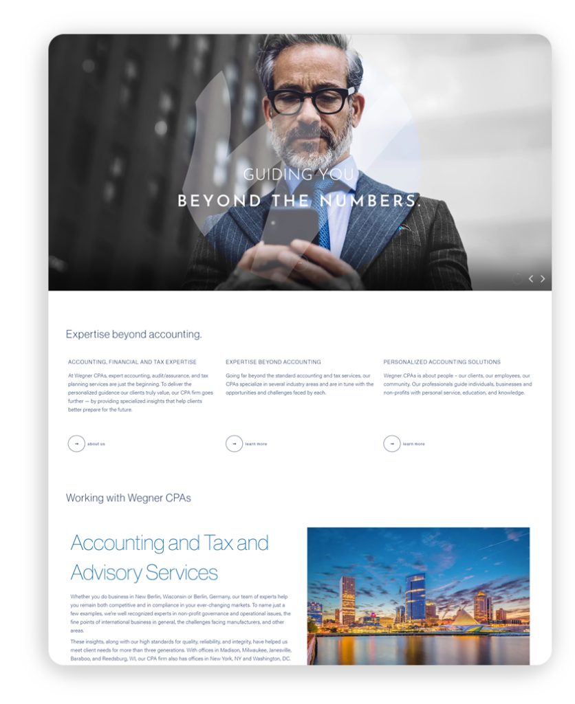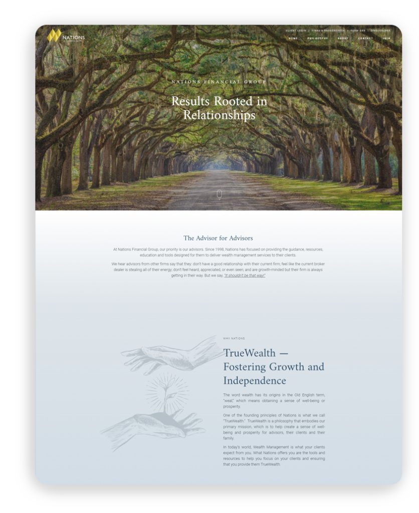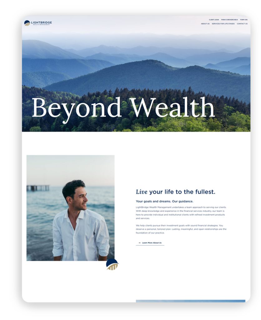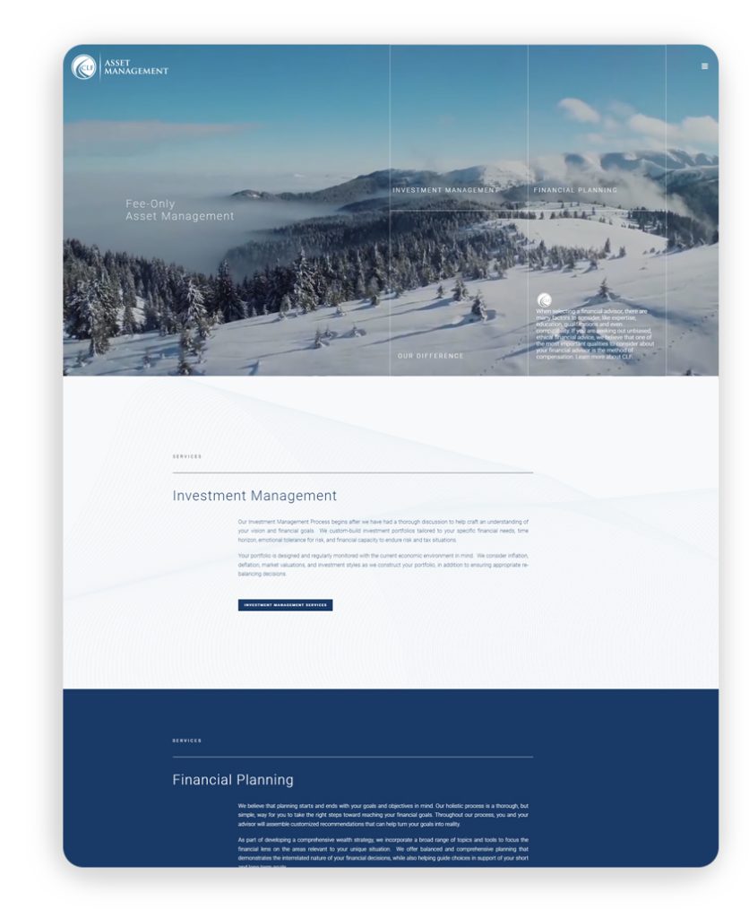 The initial part of the research includes learning more about the organization to assure that the services and the expertise are well represented. It’s crucial to capture the unique experience and culture of the company whether the website will be serving institutional or individual clients. At the core of the initial meeting is discovery and capturing the needs and wants of the client. A well-designed financial advisor website not only aligns with the brand’s color schemes, typography, and imagery, but it creates a trusting feeling for the visitors.