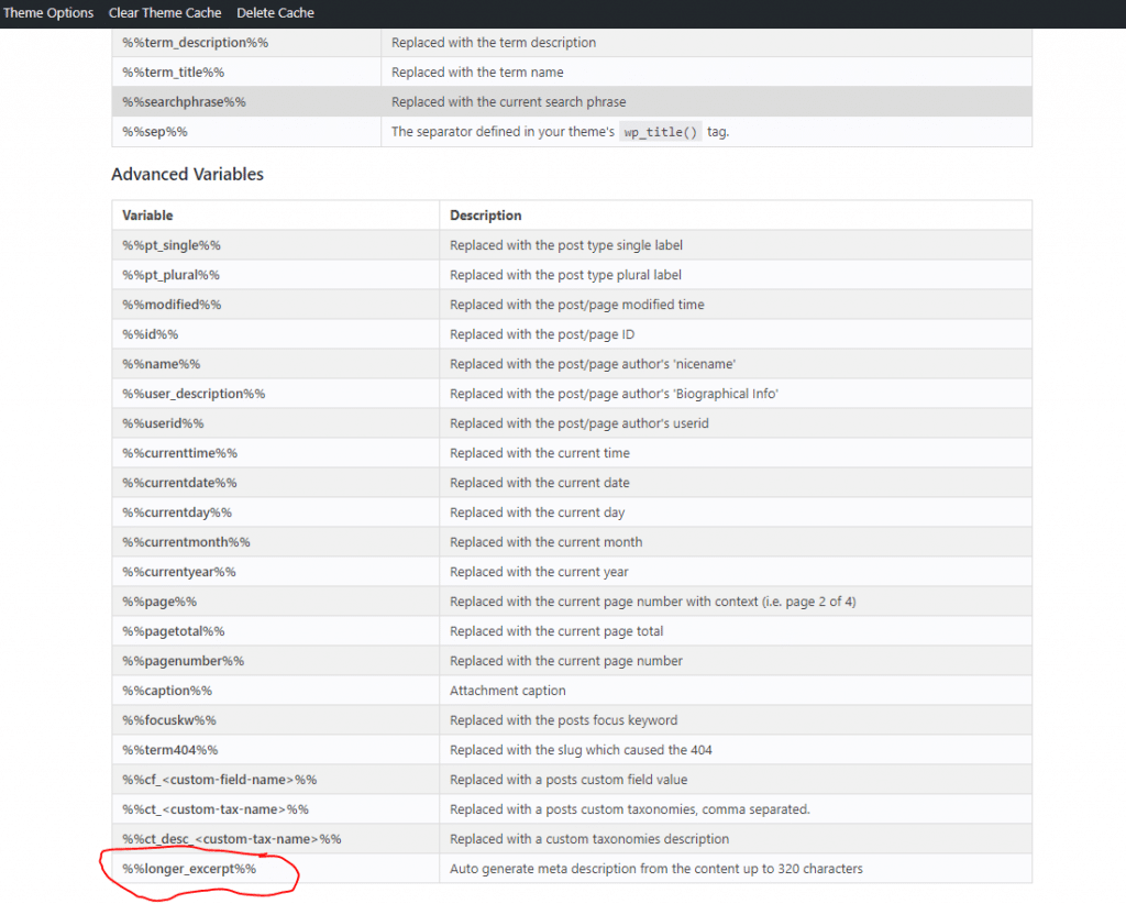 wpseo_register_var_replacement( ‘%%longer_excerpt%%’, ‘custom_length_meta_desc’, ‘advanced’, ‘Auto generate meta description from the content up to 320 characters’ );