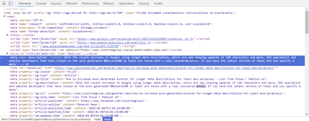 Now let’s check Chrome Inspect to see if it specifies it for the posts that do not have a set meta description.