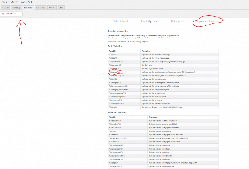 So let’s look at the variables that Yoast Gives us to work with.  Navigate the Need Help tab to expand the window and select the Template Explanation Tab.  Here you will see the variables you can use with Yoast.  If you look down some more you will see the advanced variables. If your Basic Variable will not work we will need to create a advanced variable.